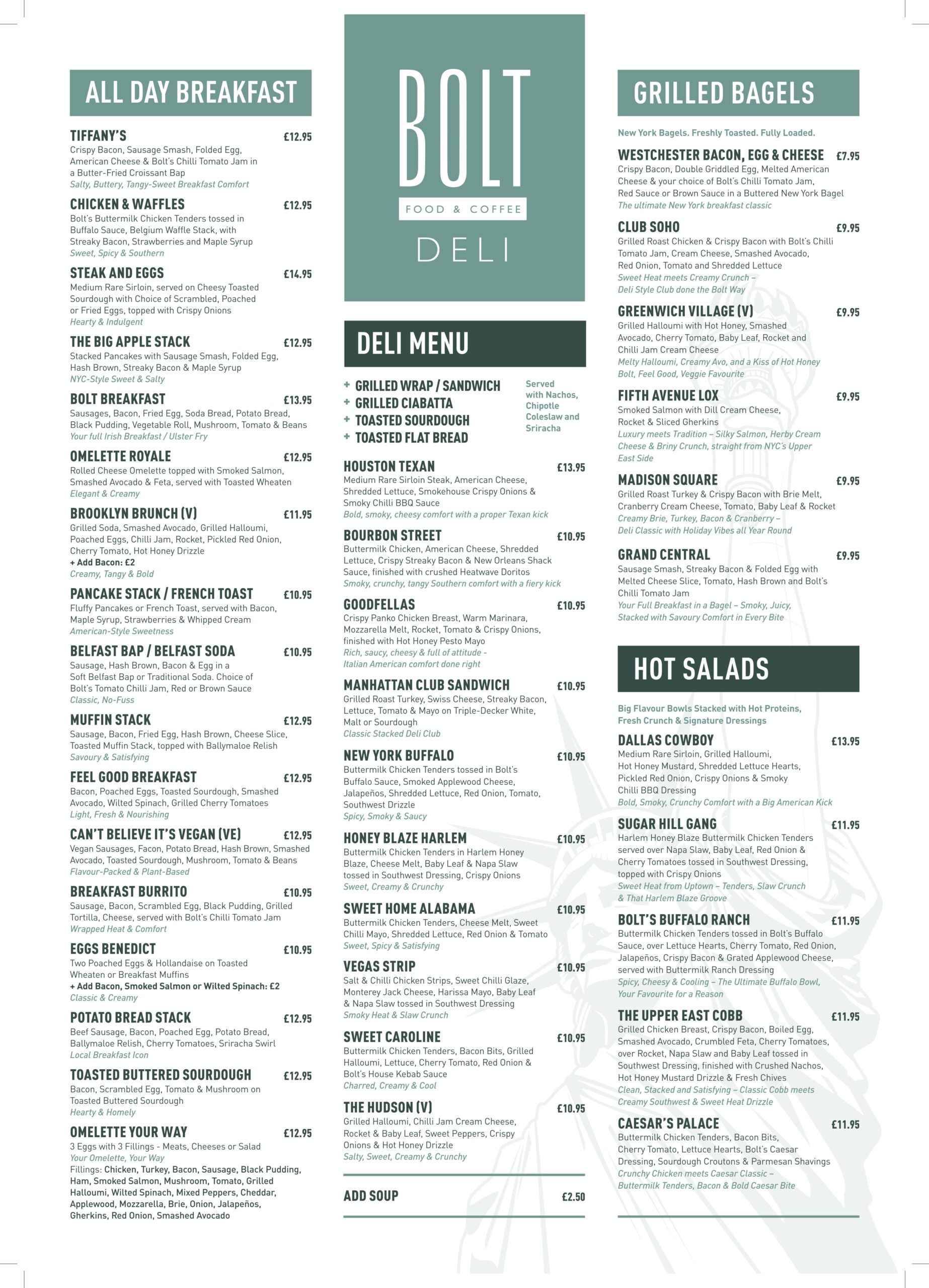 Tucked behind the Land Rover showroom on Boucher Road, Bolt Deli is a 120-seater café and restaurant bringing the soul of a New York deli to Belfast. With soaring ceilings, exposed beams, brickwork, and touches inspired by Manhattan, our space offers an authentic taste of New York’s vibrant energy.